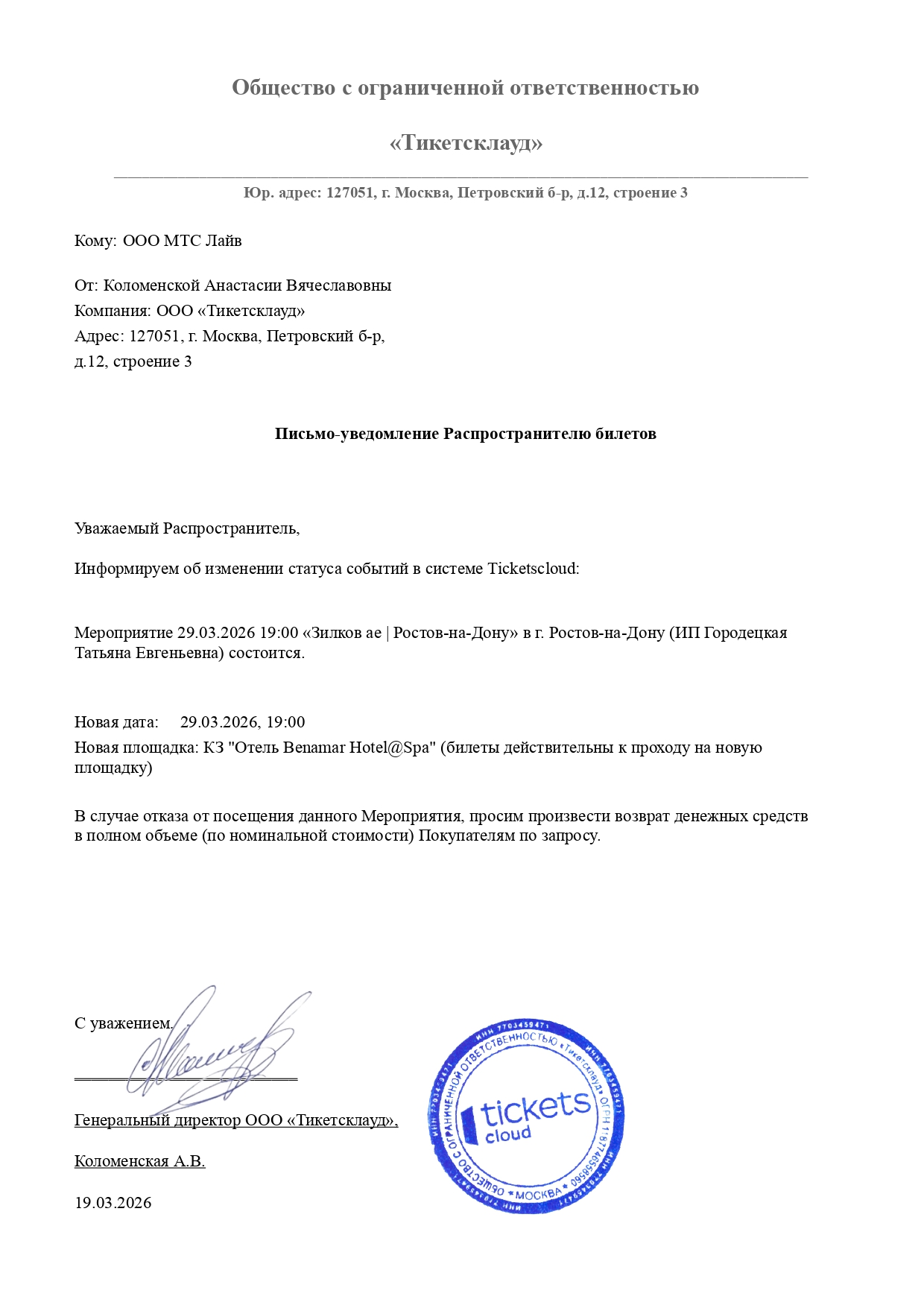 Уважаемый клиент! Спешим сообщить, что по информации, полученной от организатора, концерт «Зилков ае», запланированный на 29 марта 2026 года в 19:00 в арт-пространстве «2х2», перенесен в КЗ «Отель Benamar Hotel@Spa». Ранее приобретенные билеты действительны на новую дату, обменивать их не нужно. Если вам не удобно посетить мероприятие, вы можете вернуть билет по кнопке в личном кабинете во вкладке «Заказы». Деньги за электронные билеты вернутся автоматически в полном объёме на карту, с которой была произведена оплата. Если вы купили билет в кассе Ticketland.ru за наличный расчет, то обратитесь, пожалуйста, на почту: vozvrat@ticketland.ru. С уважением, команда поддержки Ticketland