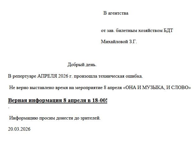 Уважаемый клиент! Обращаем ваше внимание, что по информации, полученной от организатора, верное время начала спектакля «...Она и музыка и слово...», запланированного на 8 апреля 2026 года в БДТ имени Г. А. Товстоногова - в 18:00. Ранее приобретенные билеты на 19:00 действительны на новое время в 18:00, обменивать их не нужно. С уважением, команда поддержки Ticketland.