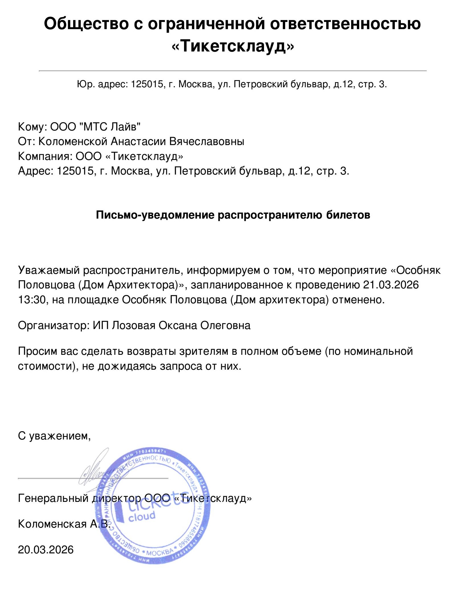 Уважаемый клиент! Спешим сообщить, что по информации, полученной от организатора, Женский Стендап + Джаз: два концерта в один вечер, запланированный на 20 марта 2026 года в 20:00 в Мзиани, отменён. Деньги за электронные билеты вернутся автоматически в полном объёме на карту, с которой была произведена оплата. Если вы купили билет в кассе Ticketland.ru за наличный расчет, то обратитесь, пожалуйста, на почту: vozvrat@ticketland.ru. С уважением, команда поддержки Ticketland.