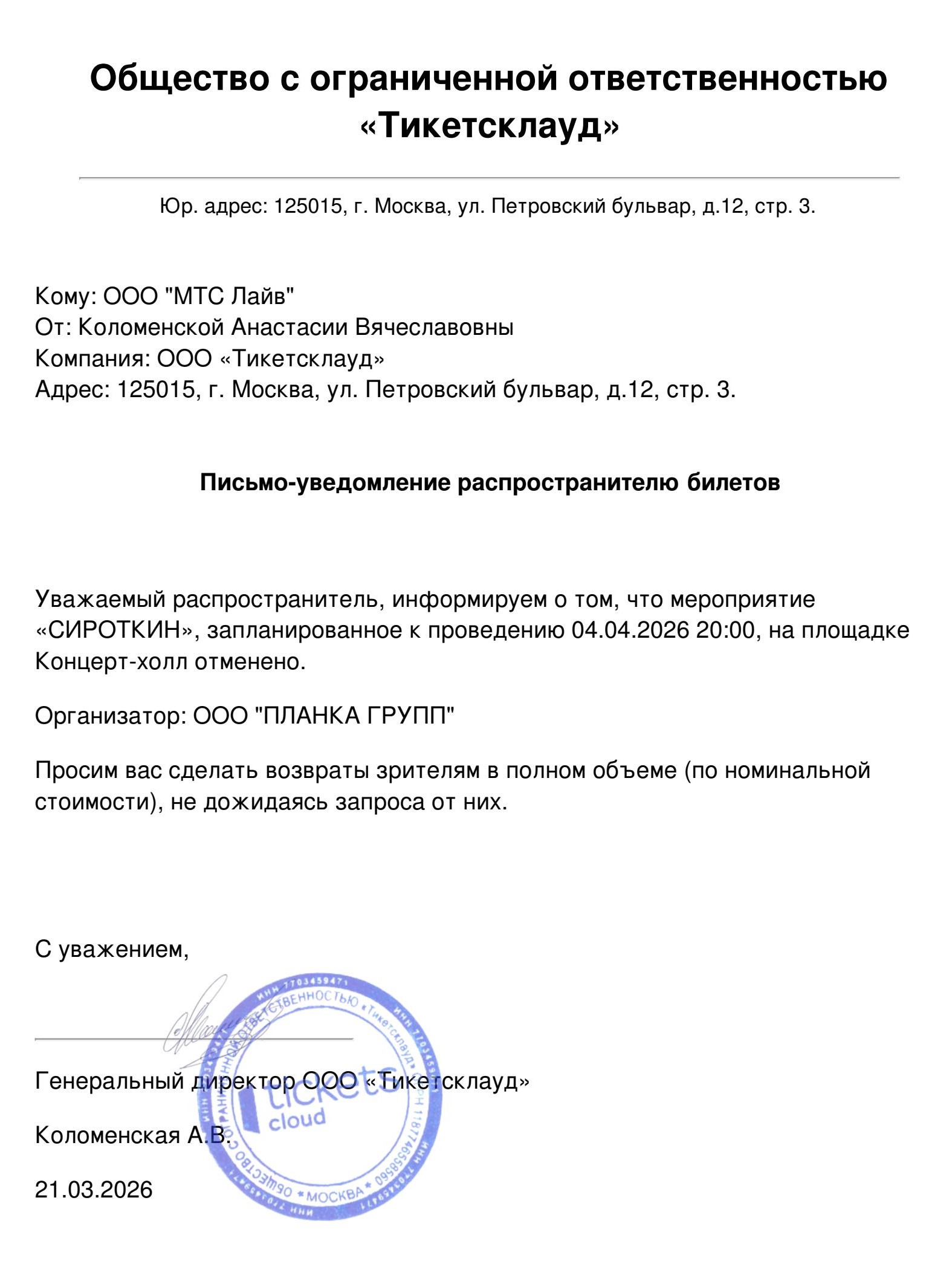 Уважаемый клиент! Спешим сообщить, что по информации, полученной от организатора, концерт «Мариам Мерабова. Латина в джазе», запланированный на 6 апреля 2025 года в 13:00 в Доме музыки, перенесен на 4 апреля 2026 года. Ранее приобретенные билеты действительны на новую дату, обменивать их не нужно. Если вам не удобно посетить мероприятие в новую дату, вы можете вернуть билет по кнопке в личном кабинете во вкладке «Заказы» (16 апреля 2025 г.). Деньги за электронные билеты вернутся автоматически в полном объёме на карту, с которой была произведена оплата. Если вы купили билет в кассе Ticketland.ru за наличный расчет, то обратитесь, пожалуйста, на почту: vozvrat@ticketland.ru. С уважением, команда поддержки Ticketland