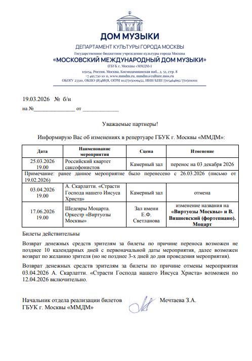 Уважаемый клиент! Спешим сообщить, что по информации, полученной от организатора, концерт Российского квартета саксофонистов, запланированный на 25 марта 2026 года в 19:00 в Доме музыки, перенесён на 3 декабря 2026 года, начало в 19:00. Ранее приобретенные билеты действительны на новую дату, обменивать их не нужно. Если вам не удобно посетить концерт в новую дату, вы можете вернуть билет по кнопке в личном кабинете во вкладке «Заказы». Деньги за электронные билеты вернутся автоматически в полном объёме на карту, с которой была произведена оплата. Если вы купили билет в кассе Ticketland.ru за наличный расчет, то обратитесь, пожалуйста, на почту: vozvrat@ticketland.ru. С уважением, команда поддержки Ticketland.