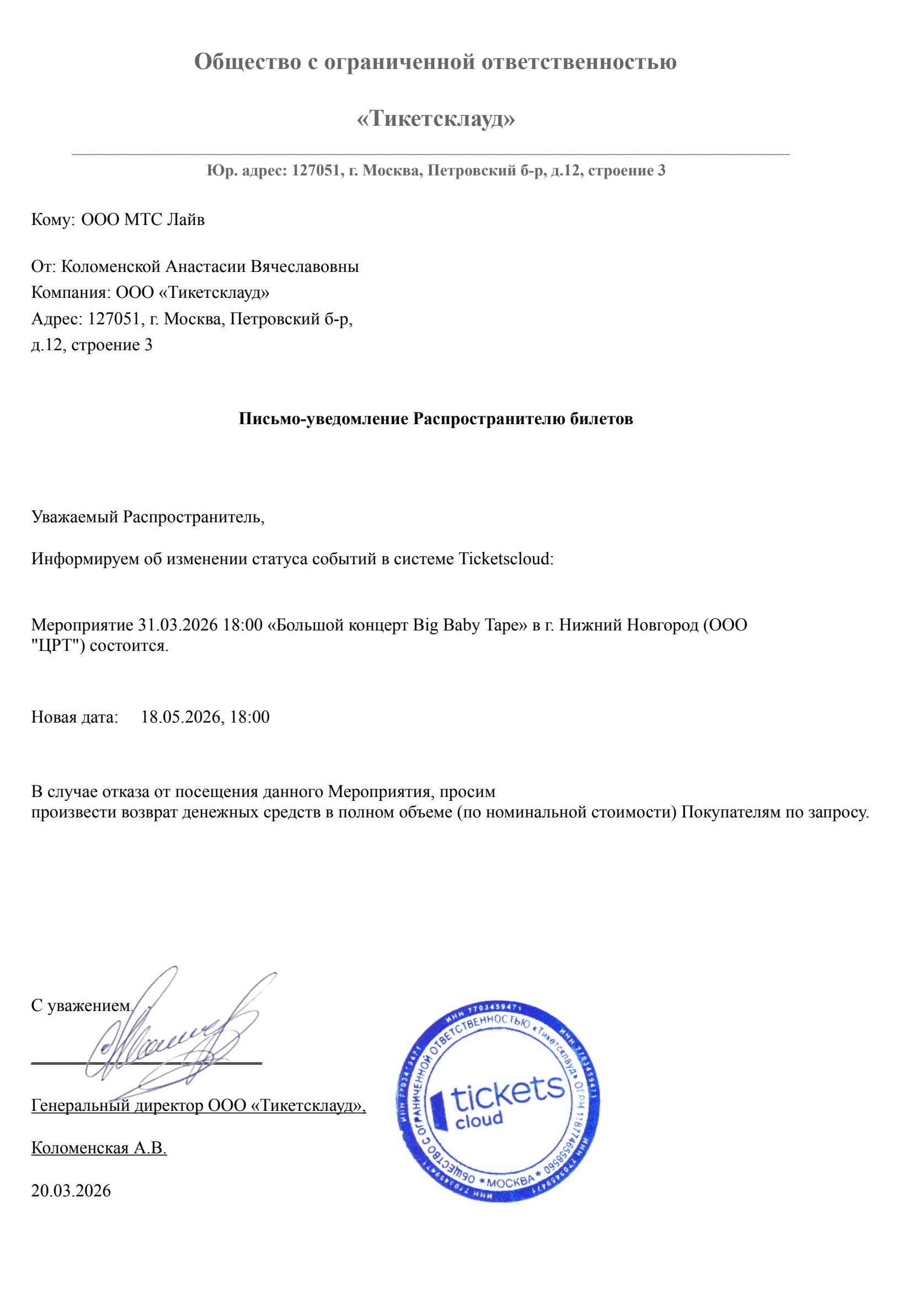 Уважаемый клиент! Спешим сообщить, что по информации, полученной от организатора, Большой концерт Big Baby Tape, запланированный на 31 марта 2026 года в 18:00 в комплексе «Нагорный», перенесён на 18 мая 2026 года, начало в 18:00. Ранее приобретенные билеты действительны на новую дату, обменивать их не нужно. Если вам не удобно посетить концерт в новую дату, вы можете вернуть билет по кнопке в личном кабинете во вкладке «Заказы». Деньги за электронные билеты вернутся автоматически в полном объёме на карту, с которой была произведена оплата. Если вы купили билет в кассе Ticketland.ru за наличный расчет, то обратитесь, пожалуйста, на почту: vozvrat@ticketland.ru. С уважением, команда поддержки Ticketland.