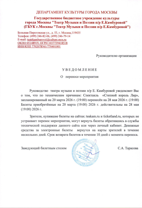 Уважаемый клиент! Спешим сообщить, что по информации, полученной от организатора, спектакль «Степной король Лир», запланированный на 20 марта 2026 года в 19:00 в театре Камбуровой, перенесен на 28 мая 2026 года. Ранее приобретенные билеты действительны, обменивать их не нужно. Если вам не удобно посетить мероприятие в новое время, вы можете вернуть билет по кнопке в личном кабинете во вкладке «Заказы» до 30 марта 2026 года включительно. Деньги за электронные билеты вернутся автоматически в полном объёме на карту, с которой была произведена оплата. Если вы купили билет в кассе Ticketland.ru за наличный расчет, то обратитесь, пожалуйста, на почту: vozvrat@ticketland.ru. С уважением, команда поддержки Ticketland.