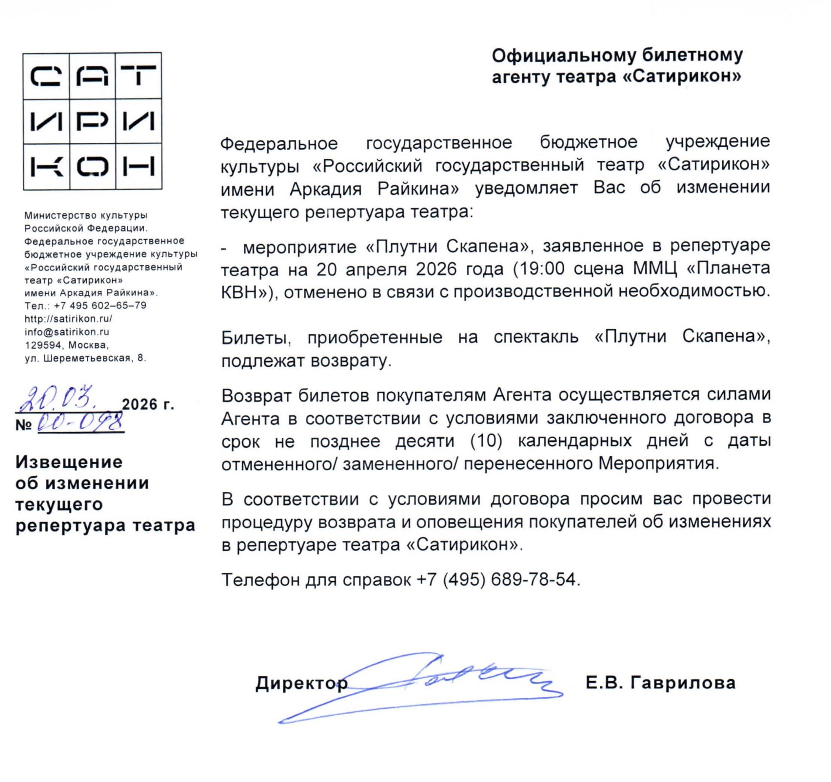 Уважаемый клиент! Спешим сообщить, что по информации, полученной от организатора, спектакль «Плутни Скапена», запланированный на 20 апреля 2026 года в 19:00 в Московском Молодежном Центре «Планета КВН», отменён. Деньги за электронные билеты вернутся автоматически в полном объёме на карту, с которой была произведена оплата. Если вы купили билет в кассе Ticketland.ru за наличный расчет или оплатили подарочной картой, то обратитесь, пожалуйста, на почту: vozvrat@ticketland.ru. С уважением, команда поддержки Ticketland.